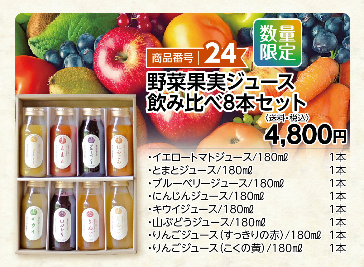 飲料 商品番号24 野菜果実ジュース飲み比べ8本セット 【送料込】 販売価格 4,800円(税込み) 会員価格 (税込み) 通常価格 (税込み) 在庫 商品コード 251124 JANコード 数量 - + カートに入れる キャンペーン おすすめギフトセット| 遠野味紀行2025冬ギフト 販売期間 2025/11/01 09:00~2026/01/01 00:00 ツイートする シェアする 株式会社 遠野ふるさと商社 [お問い合わせ]TEL.0198-62-0888(10:00~17:00) 2025年12月 日 月 火 水 木 金 土 1 2 3 4 5 6 7 8 9 10 11 12 13 14 15 16 17 18 19 20 21 22 23 24 25 26 27 28 29 30 31 2026年01月 日 月 火 水 木 金 土 1 2 3 4 5 6 7 8 9 10 11 12 13 14 15 16 17 18 19 20 21 22 23 24 25 26 27 28 29 30 31 発送休業日 ショッピングガイド 特定商取引法に基づく表記 個人情報保護方針 送料について 会員規約 お問合せ