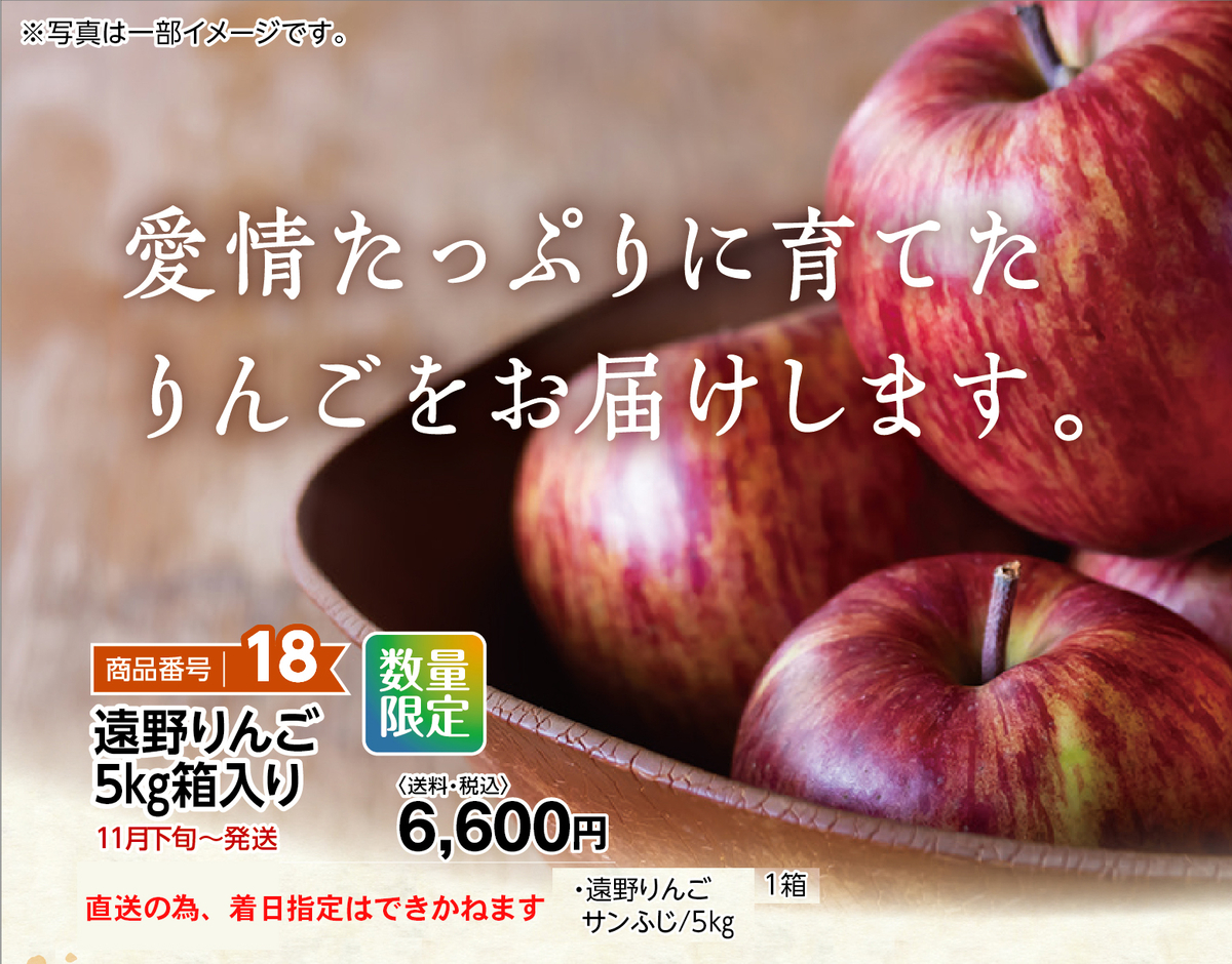 遠野味紀行2025冬ギフト 商品番号18 遠野りんご5㎏箱入り 販売価格 6,600円(税込み) 会員価格 (税込み) 通常価格 (税込み) 在庫 商品コード 251118 JANコード 数量 - + 販売期間外のため注文いただけません。 キャンペーン 遠野味紀行2025冬ギフト 個別送料 0円 販売期間 2025/11/01 09:00~2026/01/01 00:00 ツイートする シェアする 株式会社 遠野ふるさと商社 [お問い合わせ]TEL.0198-62-0888(10:00~17:00) 2025年11月 日 月 火 水 木 金 土 1 2 3 4 5 6 7 8 9 10 11 12 13 14 15 16 17 18 19 20 21 22 23 24 25 26 27 28 29 30 2025年12月 日 月 火 水 木 金 土 1 2 3 4 5 6 7 8 9 10 11 12 13 14 15 16 17 18 19 20 21 22 23 24 25 26 27 28 29 30 31 発送休業日 ショッピングガイド 特定商取引法に基づく表記 個人情報保護方針 送料について 会員規約 お問合せ