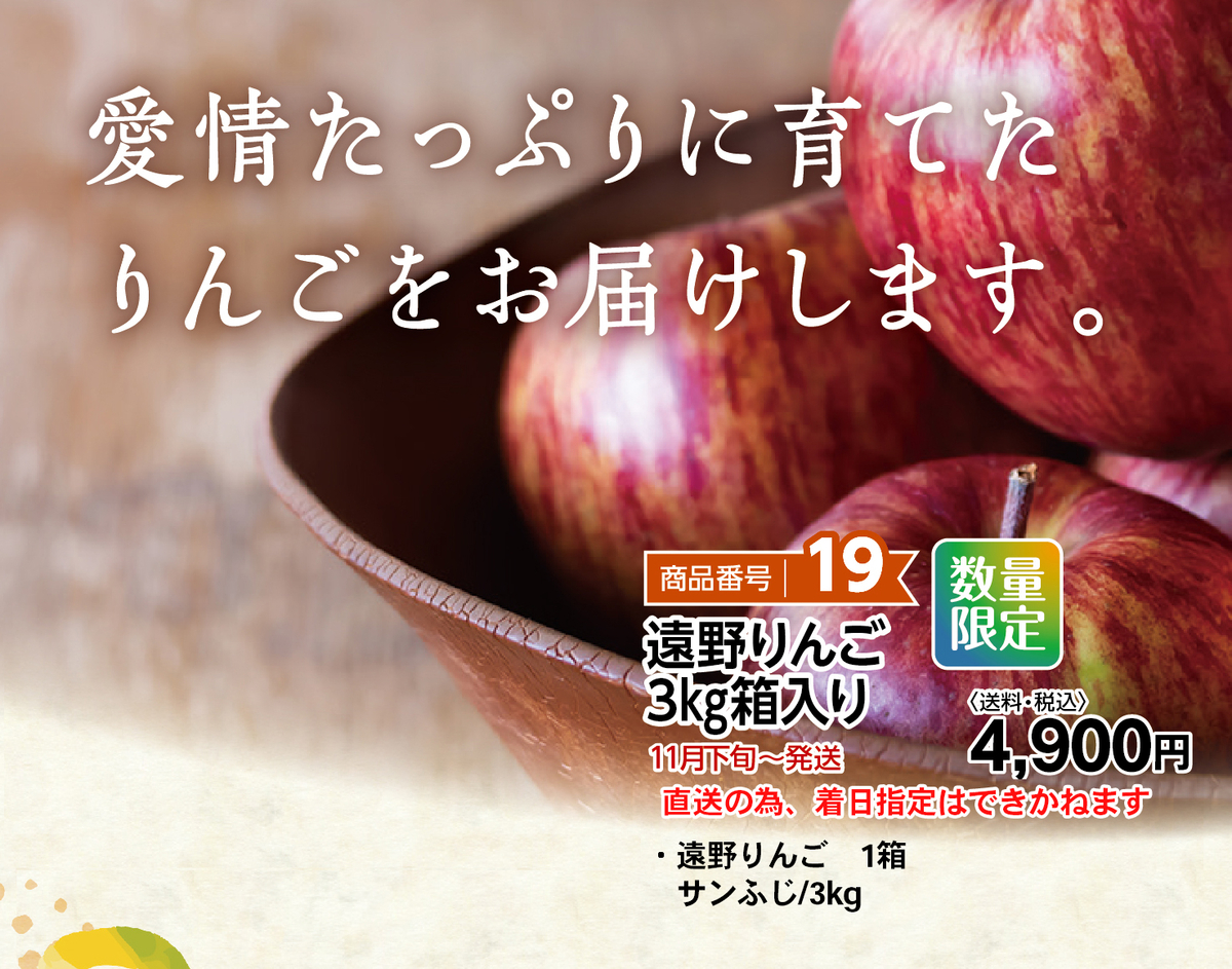 遠野味紀行2025冬ギフト 商品番号19 遠野りんご3㎏箱入り 販売価格 4,900円(税込み) 会員価格 (税込み) 通常価格 (税込み) 在庫 商品コード 251119 JANコード 数量 - + 販売期間外のため注文いただけません。 キャンペーン 遠野味紀行2025冬ギフト 個別送料 0円 販売期間 2025/11/01 09:00~2026/01/01 00:00 ツイートする シェアする 株式会社 遠野ふるさと商社 [お問い合わせ]TEL.0198-62-0888(10:00~17:00) 2025年11月 日 月 火 水 木 金 土 1 2 3 4 5 6 7 8 9 10 11 12 13 14 15 16 17 18 19 20 21 22 23 24 25 26 27 28 29 30 2025年12月 日 月 火 水 木 金 土 1 2 3 4 5 6 7 8 9 10 11 12 13 14 15 16 17 18 19 20 21 22 23 24 25 26 27 28 29 30 31 発送休業日 ショッピングガイド 特定商取引法に基づく表記 個人情報保護方針 送料について 会員規約 お問合せ
