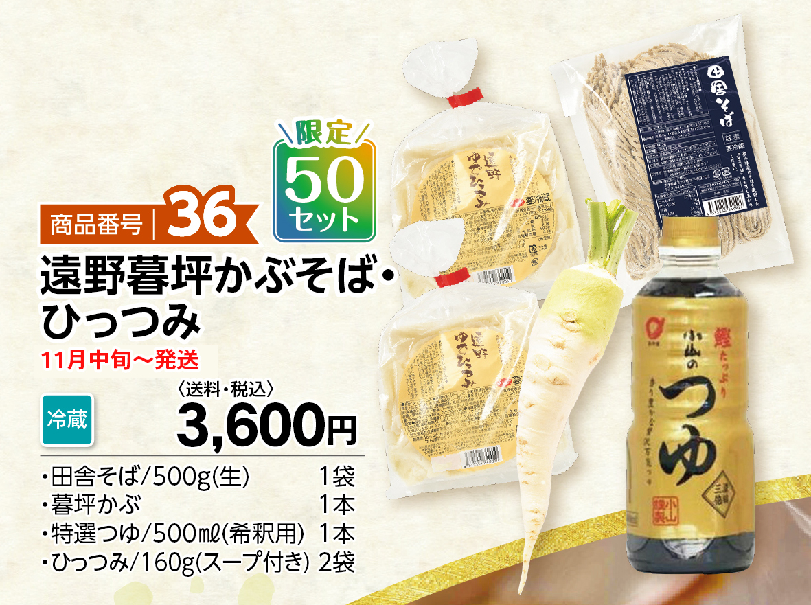 遠野味紀行2025冬ギフト 商品番号36 遠野暮坪かぶそば・ひっつみ 販売価格 3,600円(税込み) 会員価格 (税込み) 通常価格 (税込み) 在庫 ○ 商品コード 251136 JANコード 数量 - + 販売期間外のため注文いただけません。 キャンペーン 遠野味紀行2025冬ギフト 販売期間 2025/11/01 09:00~2026/01/01 00:00 ツイートする シェアする 株式会社 遠野ふるさと商社 [お問い合わせ]TEL.0198-62-0888(10:00~17:00) 2025年11月 日 月 火 水 木 金 土 1 2 3 4 5 6 7 8 9 10 11 12 13 14 15 16 17 18 19 20 21 22 23 24 25 26 27 28 29 30 2025年12月 日 月 火 水 木 金 土 1 2 3 4 5 6 7 8 9 10 11 12 13 14 15 16 17 18 19 20 21 22 23 24 25 26 27 28 29 30 31 発送休業日 ショッピングガイド 特定商取引法に基づく表記 個人情報保護方針 送料について 会員規約 お問合せ