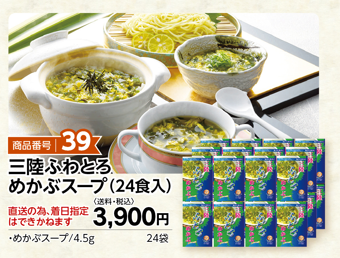 遠野味紀行2025冬ギフト 商品番号39 三陸ふわとろめかぶスープ(24食入り) 販売価格 3,900円(税込み) 会員価格 (税込み) 通常価格 (税込み) 在庫 商品コード 251139 JANコード 数量 - + 販売期間外のため注文いただけません。 キャンペーン 遠野味紀行2025冬ギフト 販売期間 2025/11/01 09:00~2026/01/01 00:00 ツイートする シェアする 株式会社 遠野ふるさと商社 [お問い合わせ]TEL.0198-62-0888(10:00~17:00) 2025年11月 日 月 火 水 木 金 土 1 2 3 4 5 6 7 8 9 10 11 12 13 14 15 16 17 18 19 20 21 22 23 24 25 26 27 28 29 30 2025年12月 日 月 火 水 木 金 土 1 2 3 4 5 6 7 8 9 10 11 12 13 14 15 16 17 18 19 20 21 22 23 24 25 26 27 28 29 30 31 発送休業日 ショッピングガイド 特定商取引法に基づく表記 個人情報保護方針 送料について 会員規約 お問合せ