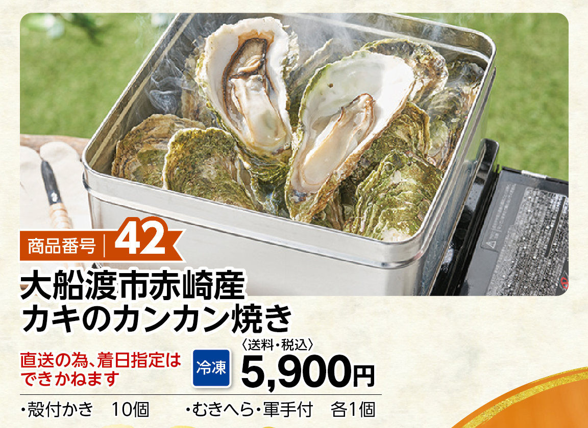 遠野味紀行2025冬ギフト 商品番号42 大船渡市赤崎産牡蠣のカンカン焼き 販売価格 5,900円(税込み) 会員価格 (税込み) 通常価格 (税込み) 在庫 商品コード 251142 JANコード 数量 - + 販売期間外のため注文いただけません。 キャンペーン 遠野味紀行2025冬ギフト 個別送料 0円 販売期間 2025/11/01 09:00~2026/01/01 00:00 ツイートする シェアする 株式会社 遠野ふるさと商社 [お問い合わせ]TEL.0198-62-0888(10:00~17:00) 2025年11月 日 月 火 水 木 金 土 1 2 3 4 5 6 7 8 9 10 11 12 13 14 15 16 17 18 19 20 21 22 23 24 25 26 27 28 29 30 2025年12月 日 月 火 水 木 金 土 1 2 3 4 5 6 7 8 9 10 11 12 13 14 15 16 17 18 19 20 21 22 23 24 25 26 27 28 29 30 31 発送休業日 ショッピングガイド 特定商取引法に基づく表記 個人情報保護方針 送料について 会員規約 お問合せ